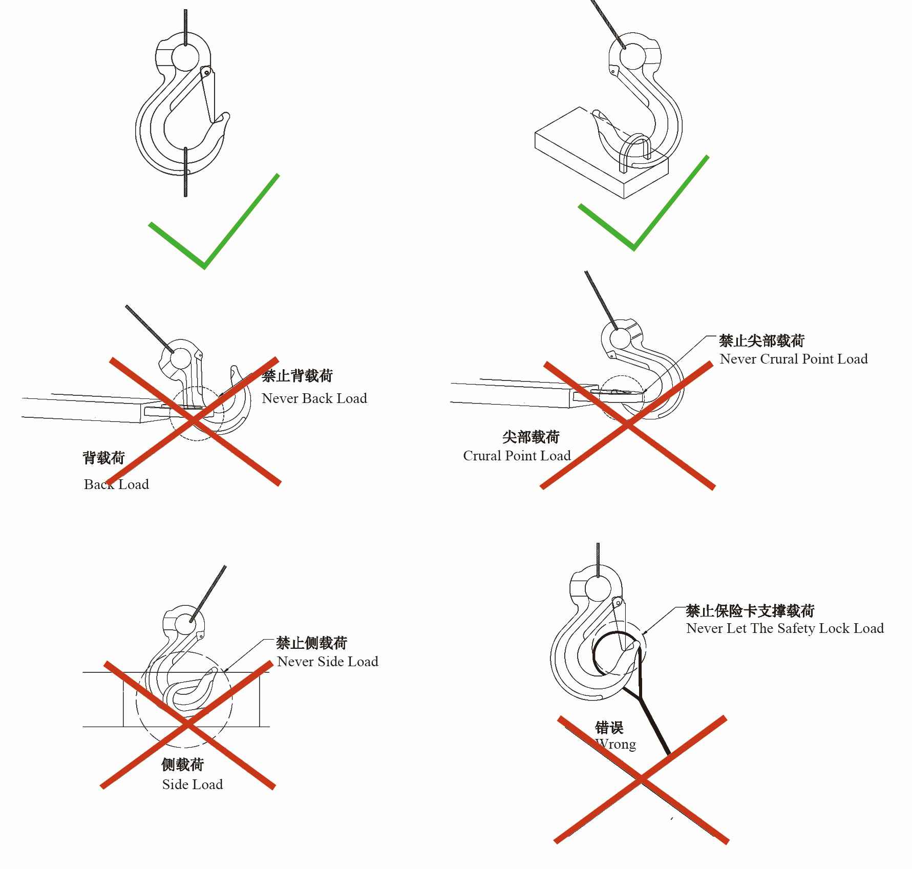 1.使用吊钩时,应将索具顶端部件挂入吊钩受力中心位置,不能直接挂入吊钩钩尖部位,如图: