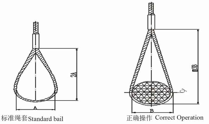 假如吊耳过大,会使绳套夹角过大,在承重时,铝管产生外张力,致使绳套抽脱,发生危险。应按如图所示.加大绳套长度,最好在受力状态下,绳套的套长与套宽之比不小于3。(以压制钢丝绳索具为例,插编钢丝绳索具同理)